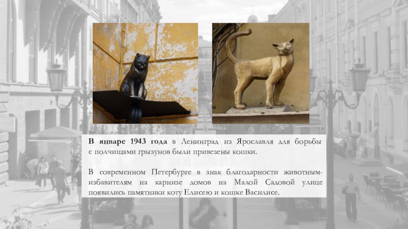 В современном Петербурге в знак благодарности животным-избавителям на карнизе домов на Малой Садовой улице появились памятники коту Елисею и кошке Василисе.