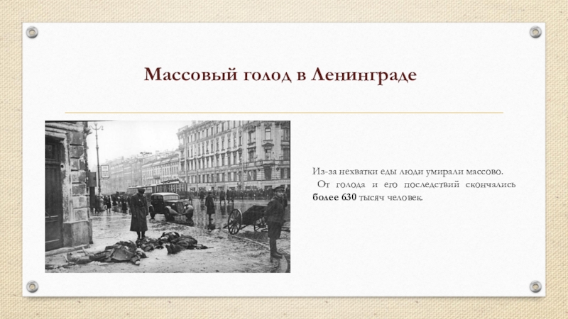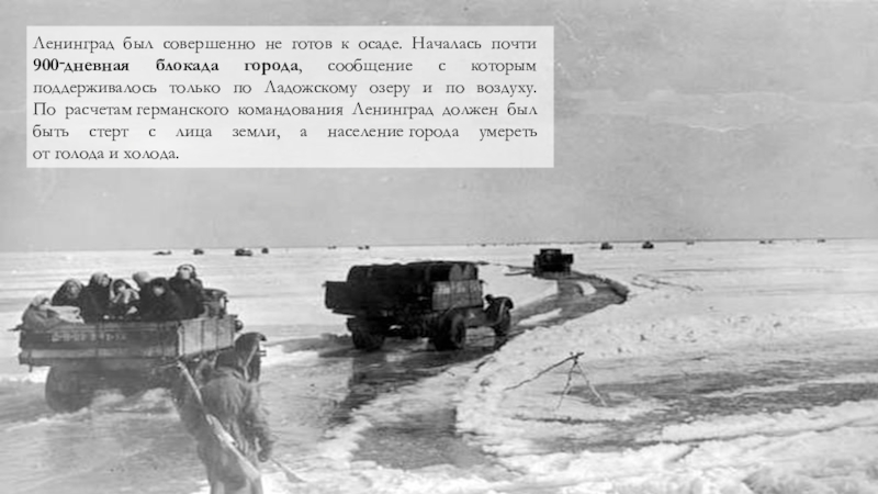 Слайд 12Ленинград был совершенно не готов к осаде. Началась почти 900‑дневная блокада
