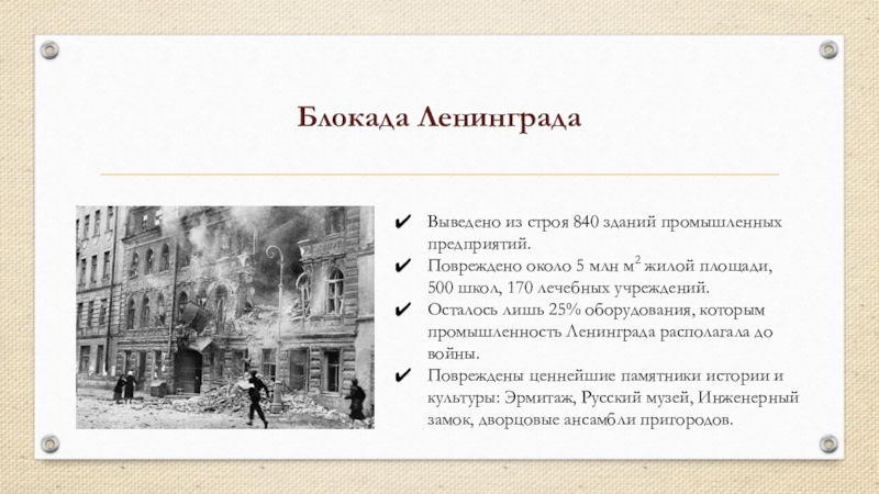 Повреждены ценнейшие памятники истории и культуры: Эрмитаж, Русский музей, Инженерный замок, дворцовые ансамбли пригородов.