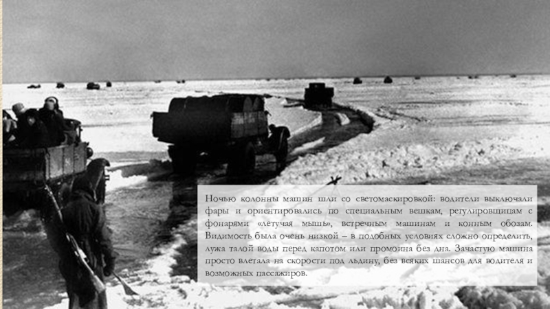 Слайд 29Ночью колонны машин шли со светомаскировкой: водители выключали фары и ориентировались