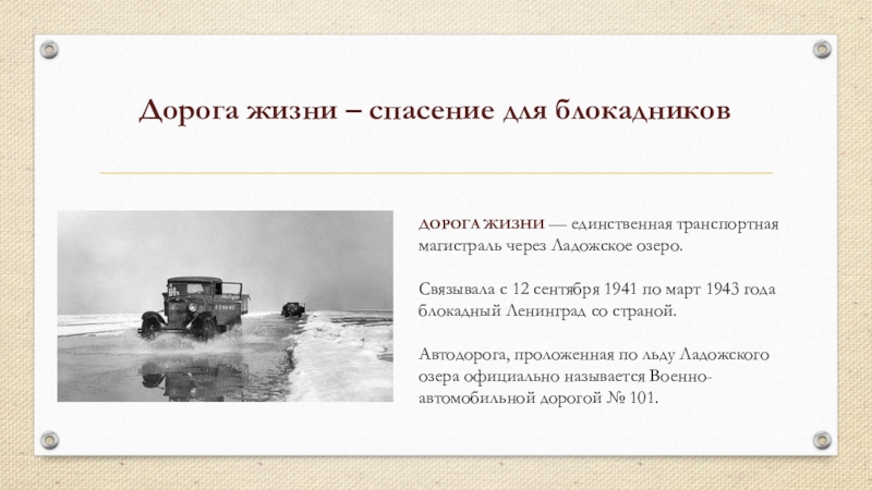 Автодорога, проложенная по льду Ладожского озера официально называется Военно-автомобильной дорогой № 101.