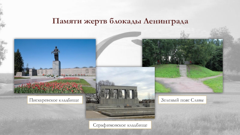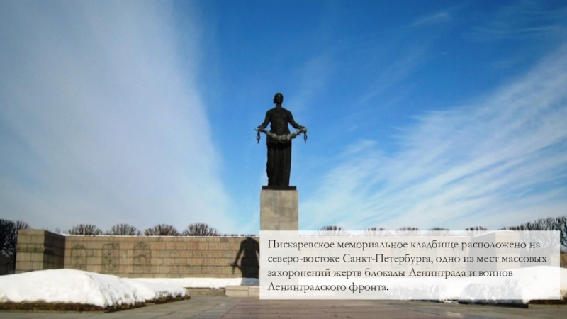 Слайд 36Пискаревское мемориальное кладбище расположено на северо-востоке Санкт-Петербурга, одно из мест массовых