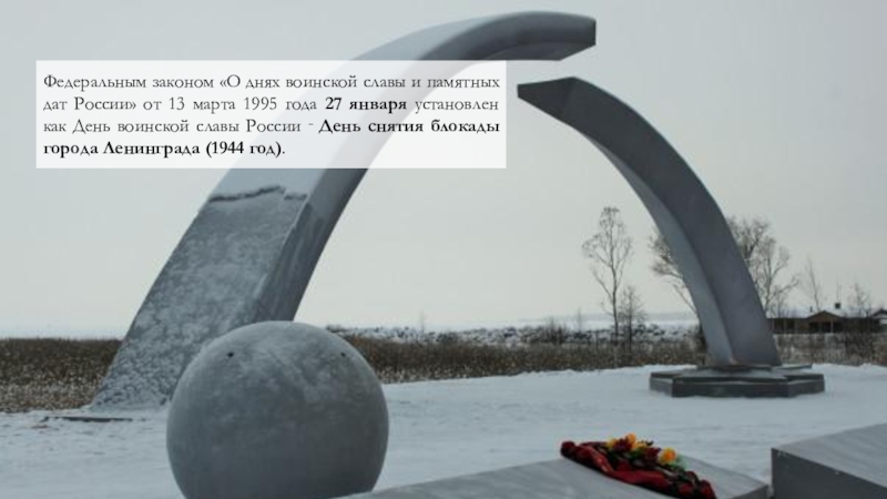 13 марта 1995 года 27 января установлен как День воинской славы России ‑ День снятия блокады города Ленинграда (1944 год).