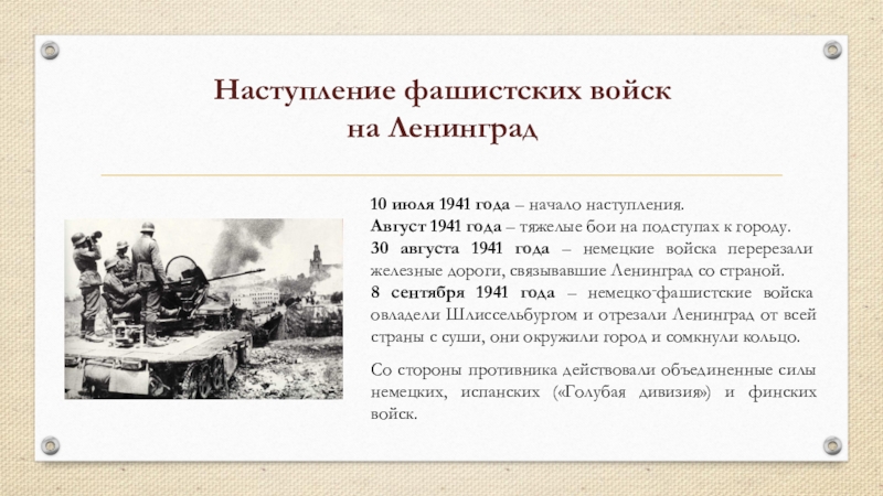 Слайд 9Блокада города Ленинграда проводилась немецкими войсками
