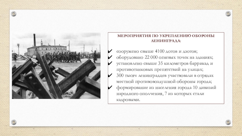Слайд 25МЕРОПРИЯТИЯ ПО УКРЕПЛЕНИЮ ОБОРОНЫ ЛЕНИНГРАДА: