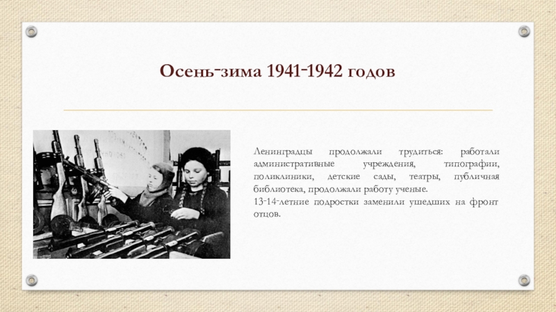 Слайд 24Ленинградцы продолжали трудиться: работали административные учреждения, типографии, поликлиники, детские сады, театры,