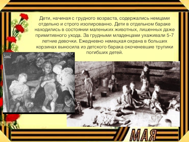 Из воспоминаний узника концлагеря в с. Чернянка Воронежской обл. Вячеслава Тимофеевича Быкова: «Больше всего мы боялись конфет. Если кому-то протягивали конфетку, мы знали – это конец. Дело в том, что в конфете был цианид…»