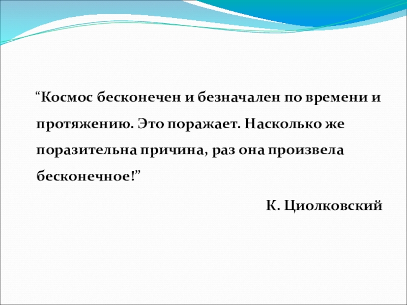 Слайд 3 “Космос бесконечен и безначален по времени и протяжению. Это поражает.