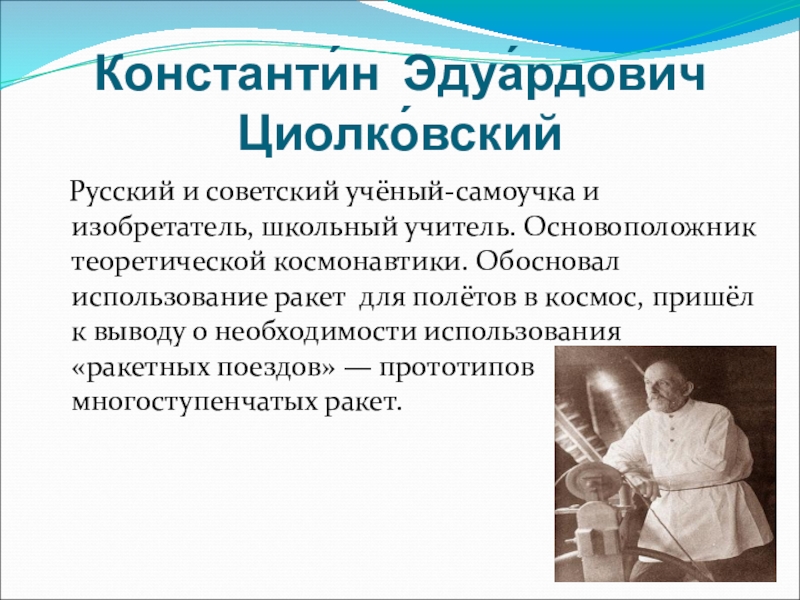 Слайд 4Константи́н Эдуа́рдович Циолко́вский