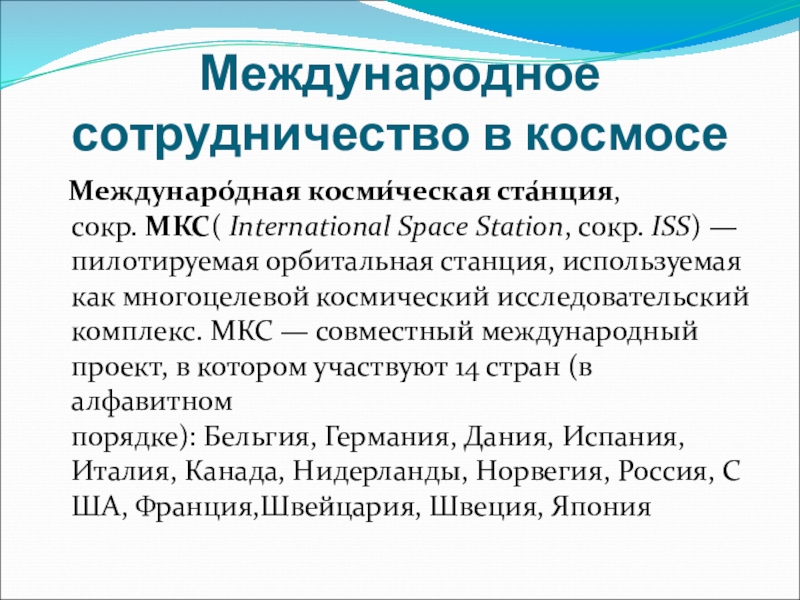 сокр. ISS) — пилотируемая орбитальная станция, используемая как многоцелевой космический исследовательский комплекс. МКС — совместный международный проект, в котором участвуют 14 стран (в алфавитном порядке): Бельгия, Германия, Дания, Испания,Италия, Канада, Нидерланды, Норвегия, Россия, США, Франция,Швейцария, Швеция, Япония