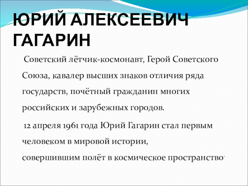 Слайд 12ЮРИЙ АЛЕКСЕЕВИЧ ГАГАРИН