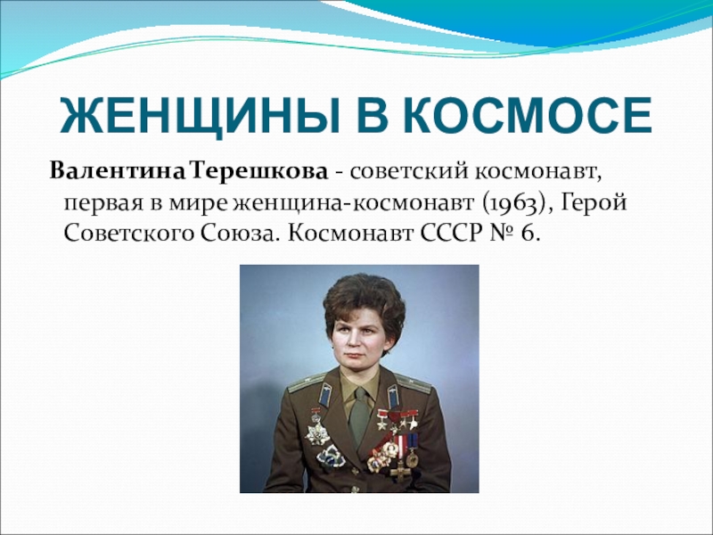 Слайд 15 Валентина Терешкова - советский космонавт, первая в мире женщина-космонавт (1963), Герой Советского Союза.