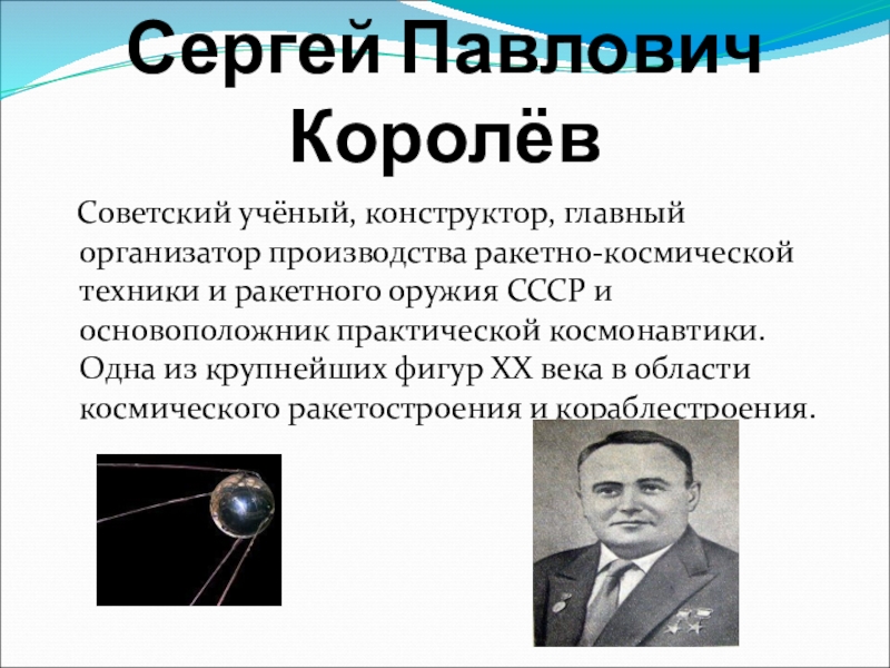 и ракетного оружия СССР и основоположник практической космонавтики. Одна из крупнейших фигур XX века в области космического ракетостроения и кораблестроения.