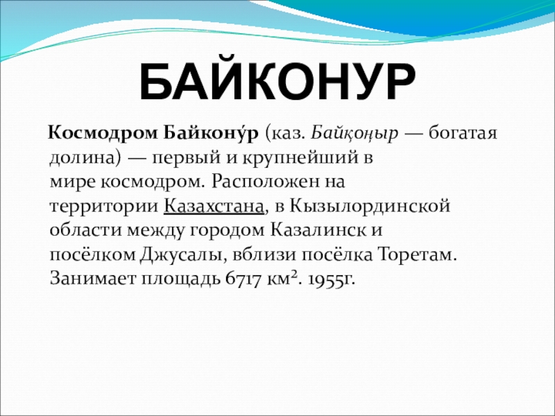Космодром Байкону́р (каз. Байқоңыр — богатая долина) — первый и крупнейший в мире космодром. Расположен