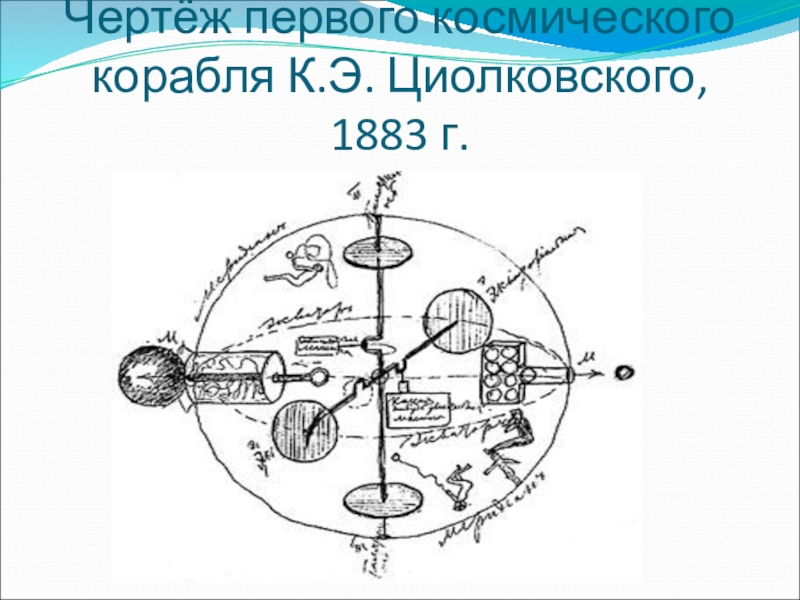 Слайд 5Чертёж первого космического корабля К.Э. Циолковского, 1883 г.