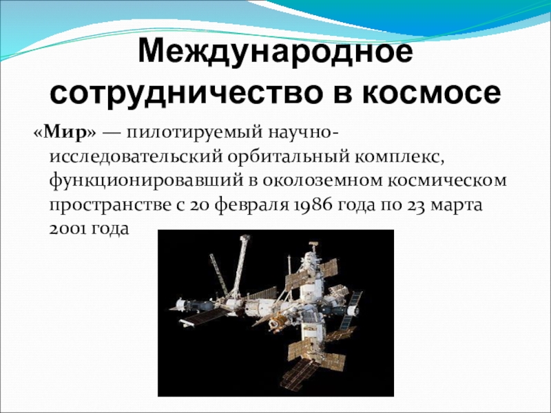 «Мир» — пилотируемый научно-исследовательский орбитальный комплекс, функционировавший в околоземном
