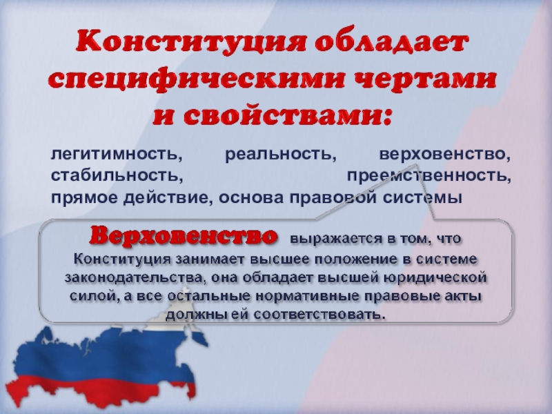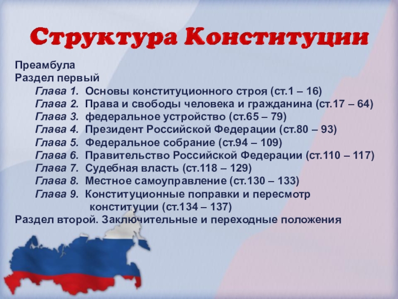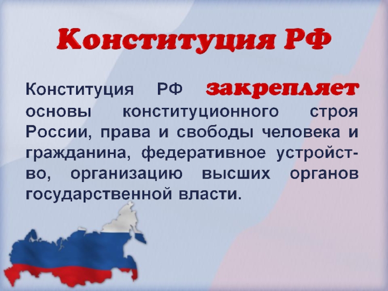 права и свободы человека и гражданина, основы общественного строя, форму правления и территориального устройства, организацию высших органов государственной власти, столицу государства и государственную символику.