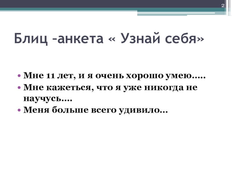 Блиц –анкета « Узнай себя» Мне 11 лет, и я очень хорошо умею…..Мне кажеться, что я уже никогда не научусь….Меня больше всего удивило…