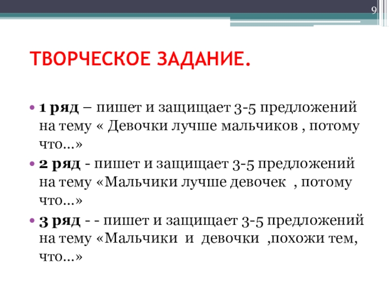 2 ряд - пишет и защищает 3-5 предложений на тему «Мальчики лучше девочек , потому что…»