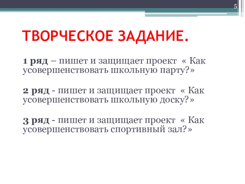 ТВОРЧЕСКОЕ ЗАДАНИЕ. 1 ряд – пишет и защищает проект « Как усовершенствовать школьную парту?»2 ряд - пишет