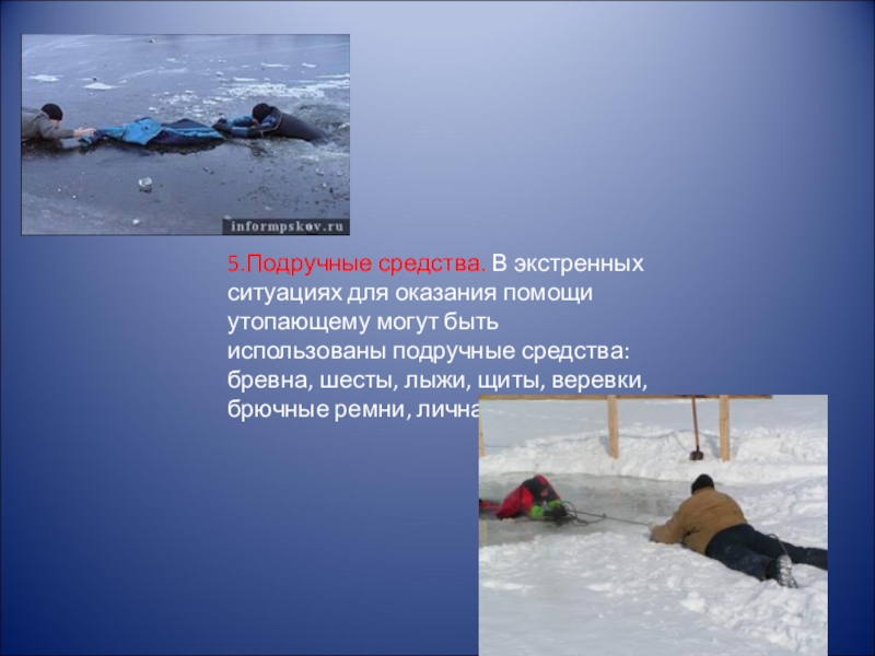 Первая помощь провалившемуся под лед включает следующие этапы:
