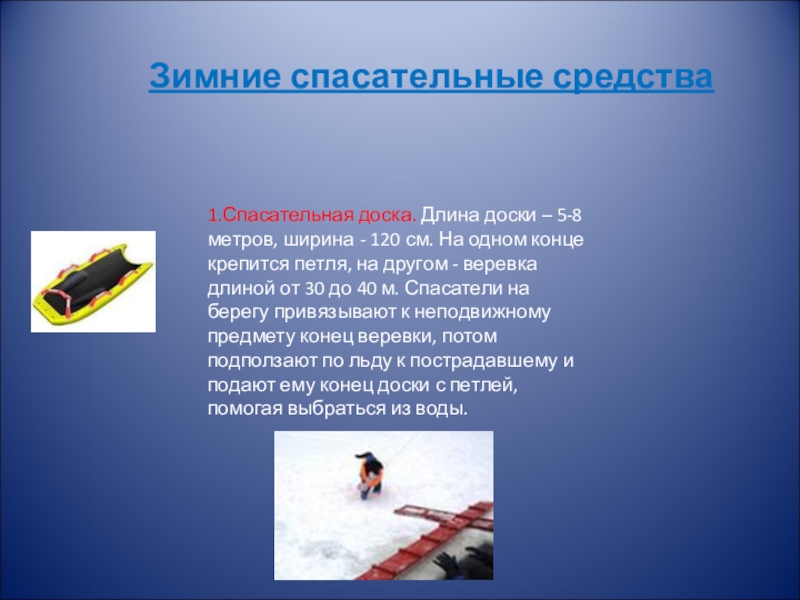 Каждому рыболову рекомендуется иметь спасательное средство в виде шнура длиной 12- 15 метров, на одном конце которого должен быть закреплен груз весом 400-500 граммов, а на другом - изготовлена петля.