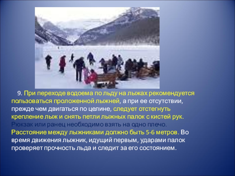 • Передвигаясь по льду, обходите темные пятна: здесь лед очень хрупкий.