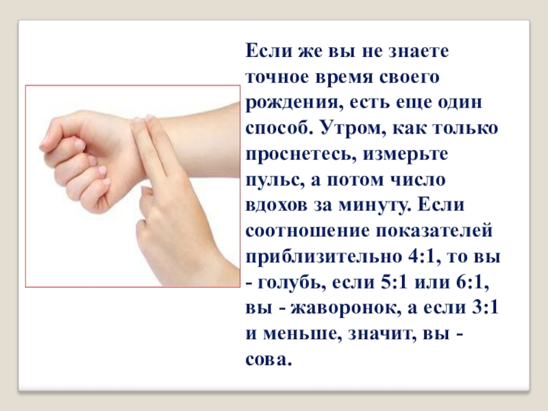 один способ. Утром, как только проснетесь, измерьте пульс, а потом число вдохов за минуту. Если соотношение показателей приблизительно 4:1, то вы - голубь, если 5:1 или 6:1, вы - жаворонок, а если 3:1 и меньше, значит, вы - сова.