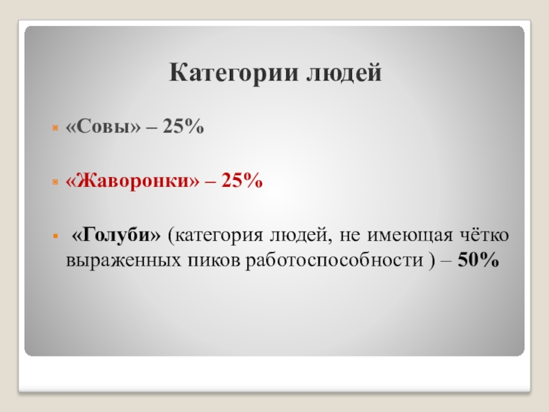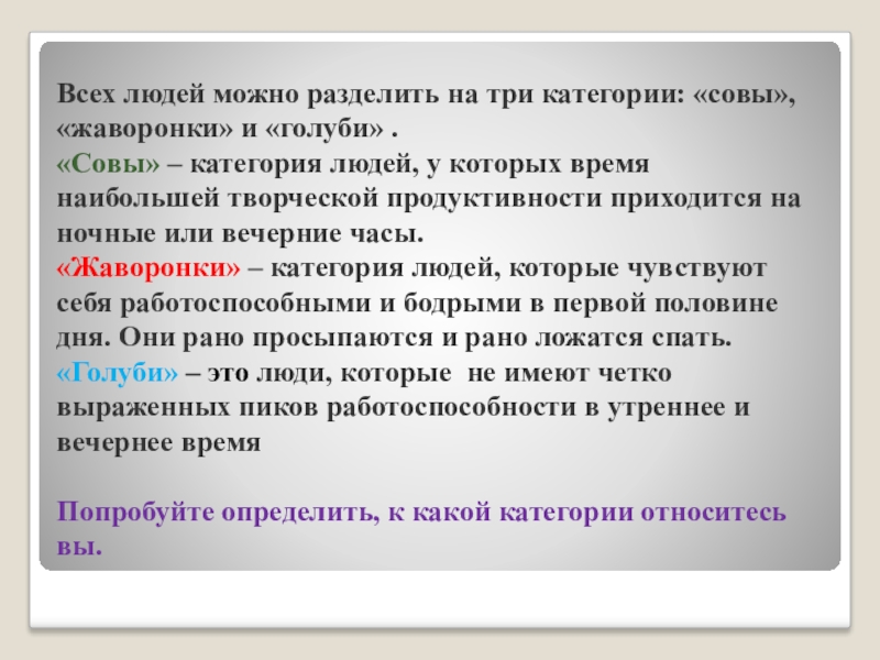 Всех людей можно разделить на три категории: «совы», «жаворонки» и «голуби» по отношению ко времени.