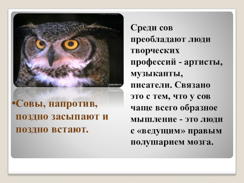 Слайд 23Среди сов преобладают люди творческих профессий - артисты, музыканты, писатели. Связано
