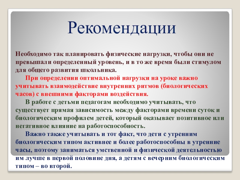 При определении оптимальной нагрузки на уроке важно учитывать взаимодействие внутренних ритмов (биологических часов) с внешними факторами воздействия.
