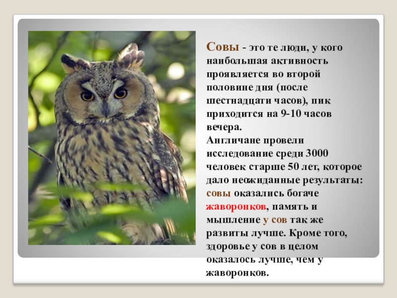 Англичане провели исследование среди 3000 человек старше 50 лет, которое дало неожиданные результаты: совы оказались богаче жаворонков, память и мышление у сов так же развиты лучше. Кроме того, здоровье у сов в целом оказалось лучше, чем у жаворонков.