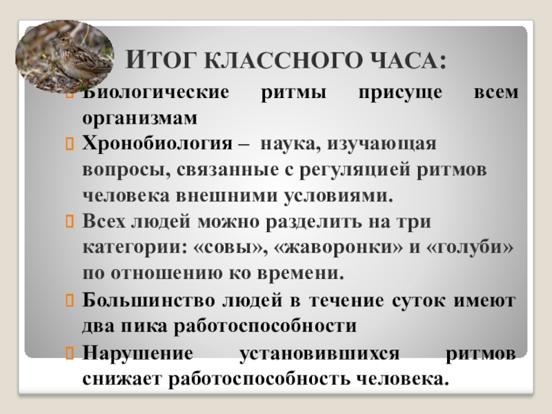 что уже с самого рождения у человека есть собственные биоритмы. Те, кто родился в период с 4.00 до 11.00 - жаворонки, совы же рождаются с 16.00 до полуночи. Рожденные в оставшиеся часы - голуби.