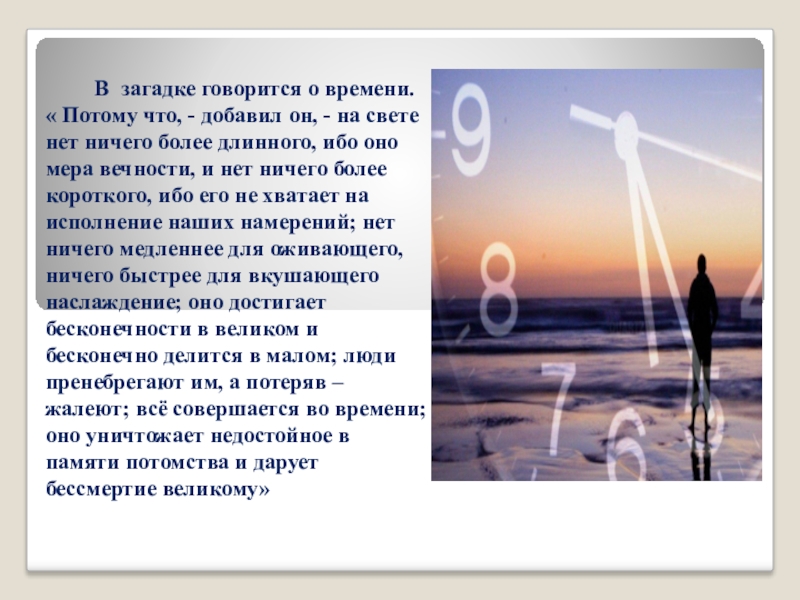 «Что на свете всего длиннее и всего короче, всего быстрее и всего медленнее, что легче всего делится на величины бесконечно малые и достигает величин бесконечно больших, чем больше всего пренебрегают и о чём больше всего жалеют, без чего нельзя ничего совершить, что пожирает всё ничтожное и воскрешает всё великое?»