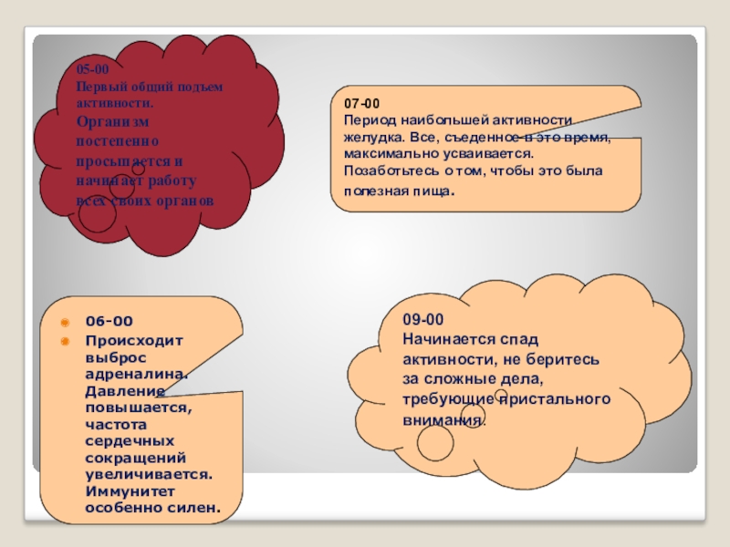 Первый общий подъем активности. Организм постепенно просыпается и начинает работу всех
