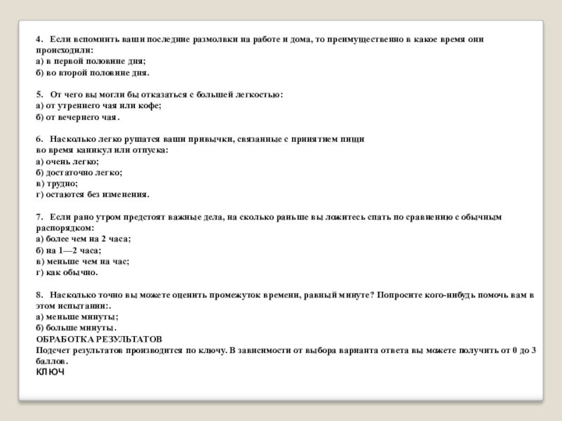 Тест А. А. Путилова (определение биологического типа – «голуби»,«сова» или «жаворонок»)