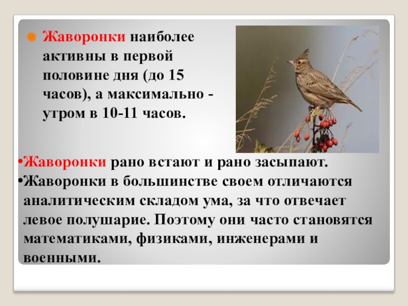Слайд 21Жаворонки наиболее активны в первой половине дня (до 15 часов), а