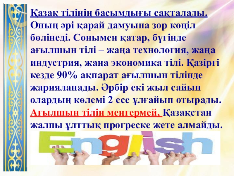 Сонымен қатар, бүгінде ағылшын тілі – жаңа технология, жаңа индустрия, жаңа экономика тілі. Қазіргі кезде 90% ақпарат ағылшын тілінде жарияланады. Әрбір екі жыл сайын олардың көлемі 2 есе ұлғайып отырады. Ағылшын тілін меңгермей, Қазақстан жалпы ұлттық прогреске жете алмайды.