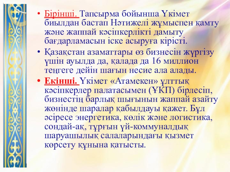 Слайд 11Бірінші. Тапсырма бойынша Үкімет биылдан бастап Нәтижелі жұмыспен қамту және жаппай