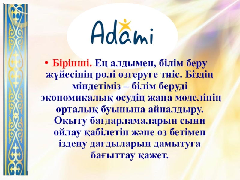Слайд 19Бірінші. Ең алдымен, білім беру жүйесінің рөлі өзгеруге тиіс. Біздің міндетіміз