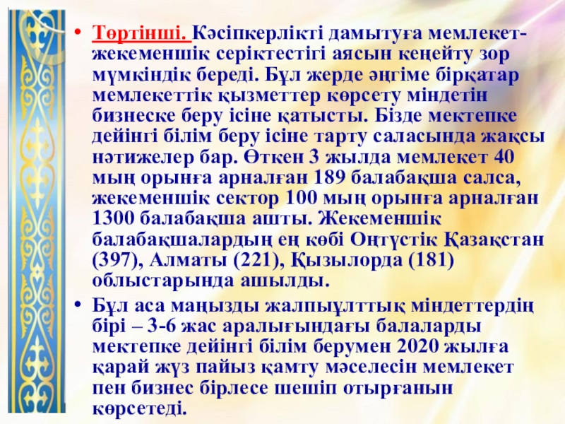 жерде әңгіме бірқатар мемлекеттік қызметтер көрсету міндетін бизнеске беру ісіне қатысты. Бізде мектепке дейінгі білім беру ісіне тарту саласында жақсы нәтижелер бар. Өткен 3 жылда мемлекет 40 мың орынға арналған 189 балабақша салса, жекеменшік сектор 100 мың орынға арналған 1300 балабақша ашты. Жекеменшік балабақшалардың ең көбі Оңтүстік Қазақстан (397), Алматы (221), Қызылорда (181) облыстарында ашылды.
