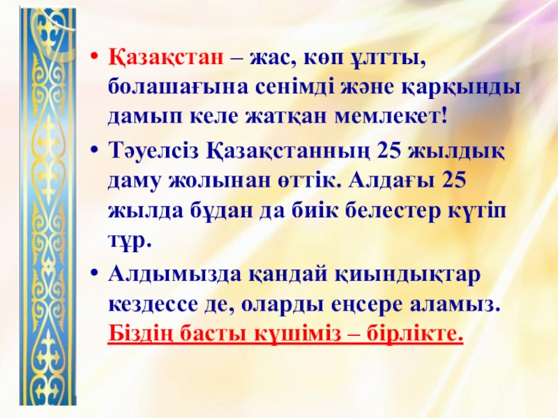 Слайд 28Қазақстан – жас, көп ұлтты, болашағына сенімді және қарқынды дамып келе
