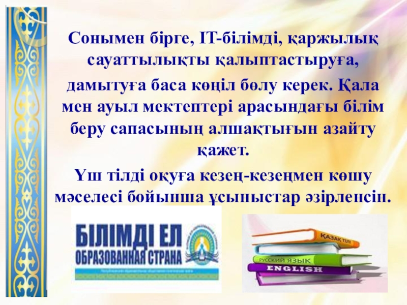 Слайд 20Сонымен бірге, IT-білімді, қаржылық сауаттылықты қалыптастыруға,