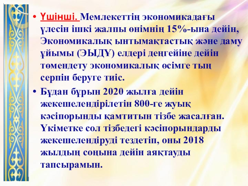 Слайд 12Үшінші. Мемлекеттің экономикадағы үлесін ішкі жалпы өнімнің 15%-ына дейін, Экономикалық ынтымақтастық
