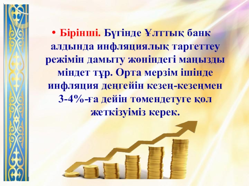 Слайд 16Бірінші. Бүгінде Ұлттық банк алдында инфляциялық таргеттеу режімін дамыту жөніндегі маңызды