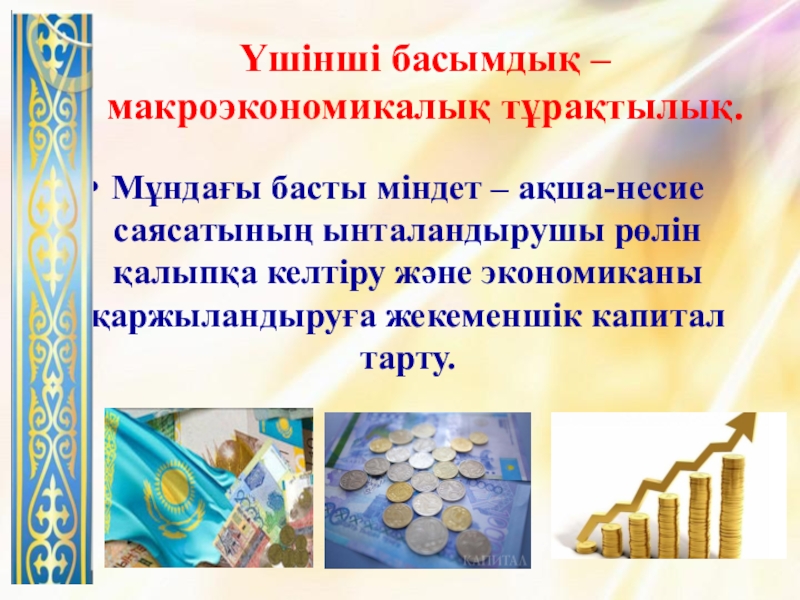 Слайд 15Үшінші басымдық – макроэкономикалық тұрақтылық.
