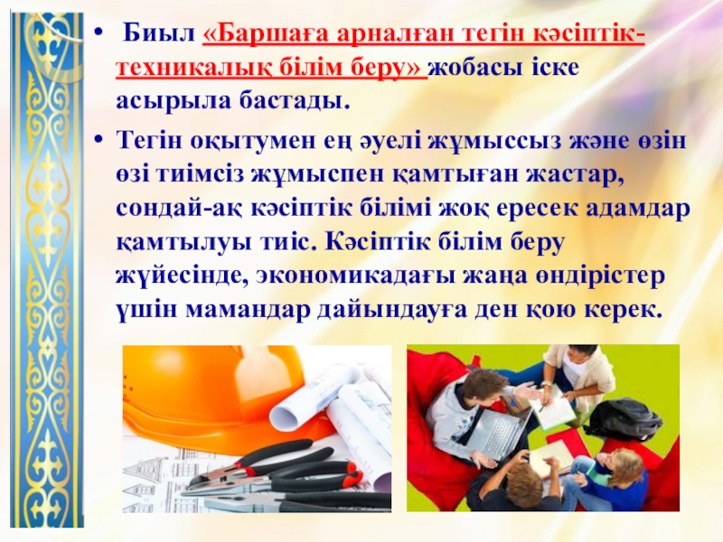 Слайд 23 Биыл «Баршаға арналған тегін кәсіптік-техникалық білім беру» жобасы іске асырыла бастады.