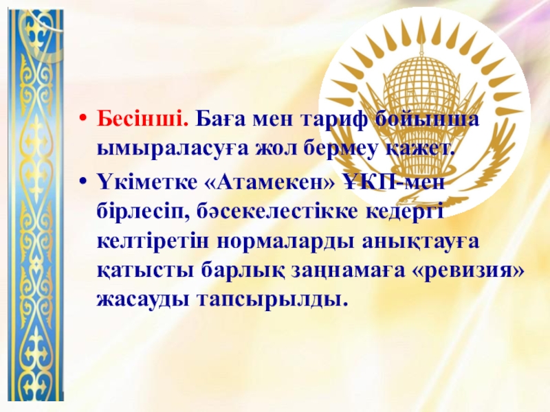 Слайд 14Бесінші. Баға мен тариф бойынша ымыраласуға жол бермеу қажет.
