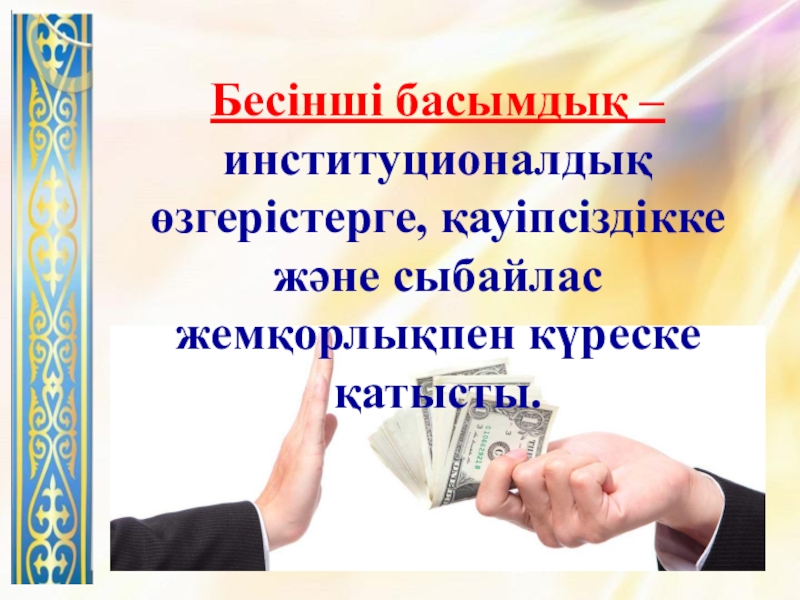 Слайд 26Бесінші басымдық – институционалдық өзгерістерге, қауіпсіздікке және сыбайлас жемқорлықпен күреске қатысты.
