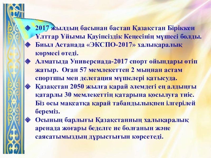 Слайд 42017 жылдың басынан бастап Қазақстан Біріккен Ұлттар Ұйымы Қауіпсіздік Кеңесінің мүшесі